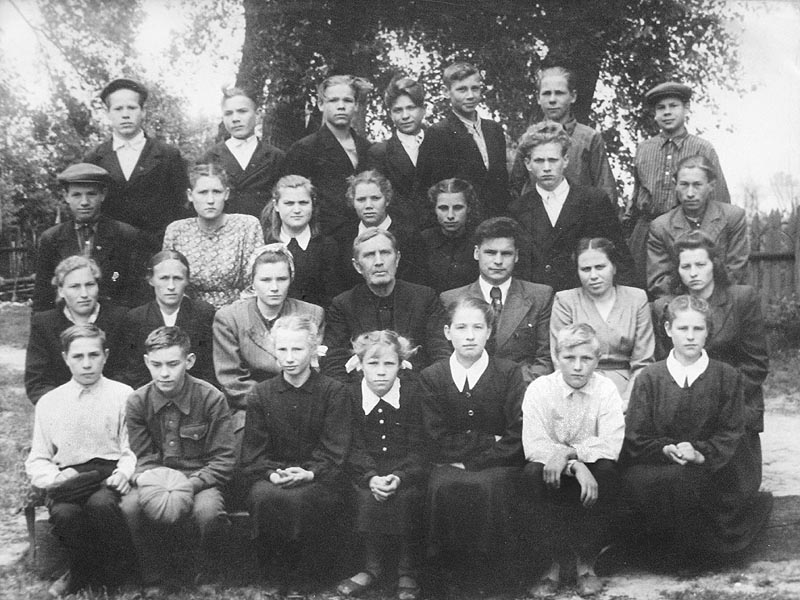Учителя и учащиеся Елатомской основной общеобразовательной школы. В центре директор школы Протасов Алексей Григорьевич. Фото 50-х годов ХХ века.