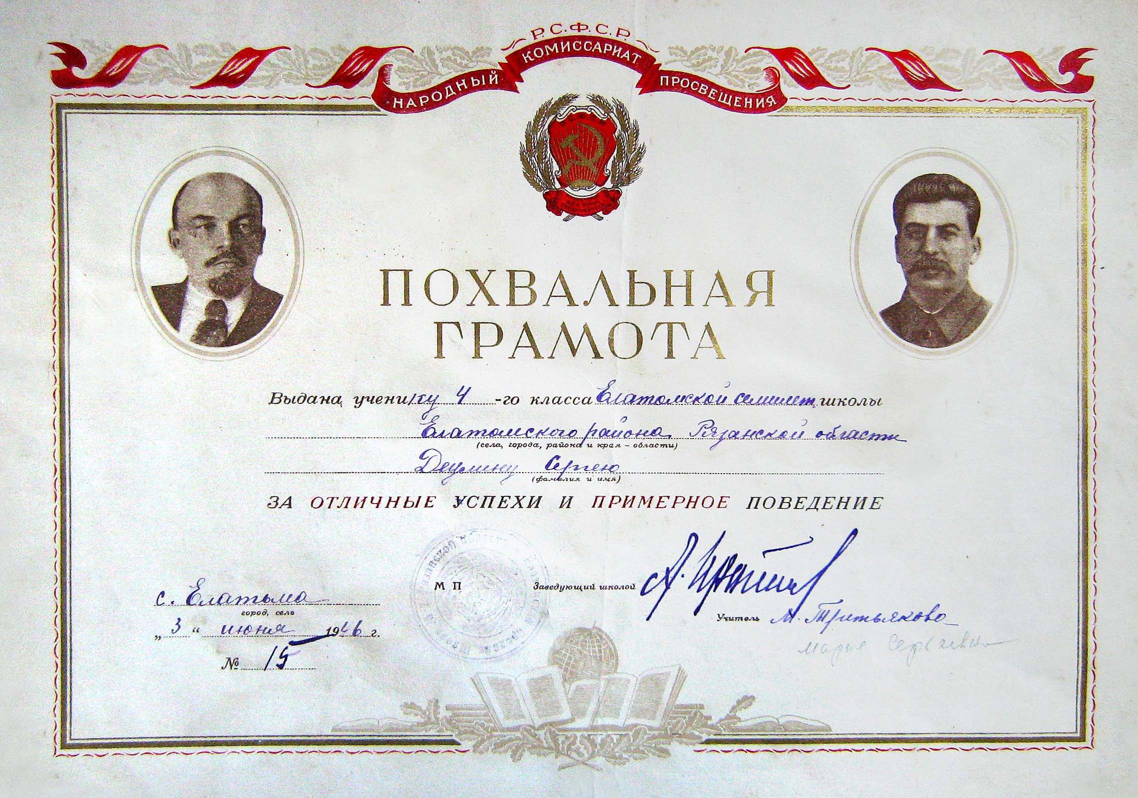 Похвальная грамота ученику 4 класса Елатомской семилетней школы Деулину Сергею. 3 июня 1949 года. (для увеличения и детализации изображения кликните по фотоснимку)